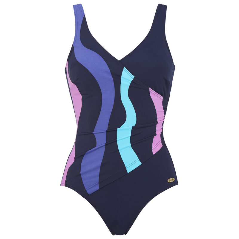 Draperingen på baddräktens framsida i kontrasterande tyg skapar en elegant och smickrande look.