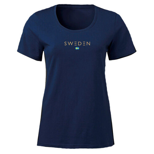 Stilren t-shirt till dam från Nordic Souvenir, med en liten svensk flagga och texten "Sweden" i guld.