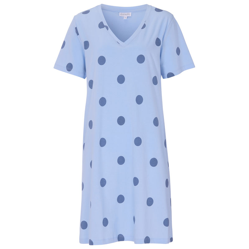 Bekvämt nattlinne i en fin prickig design från Damella of Sweden. Tillverkad med omsorg i ekologisk bomull med rund hals och kort ärm.