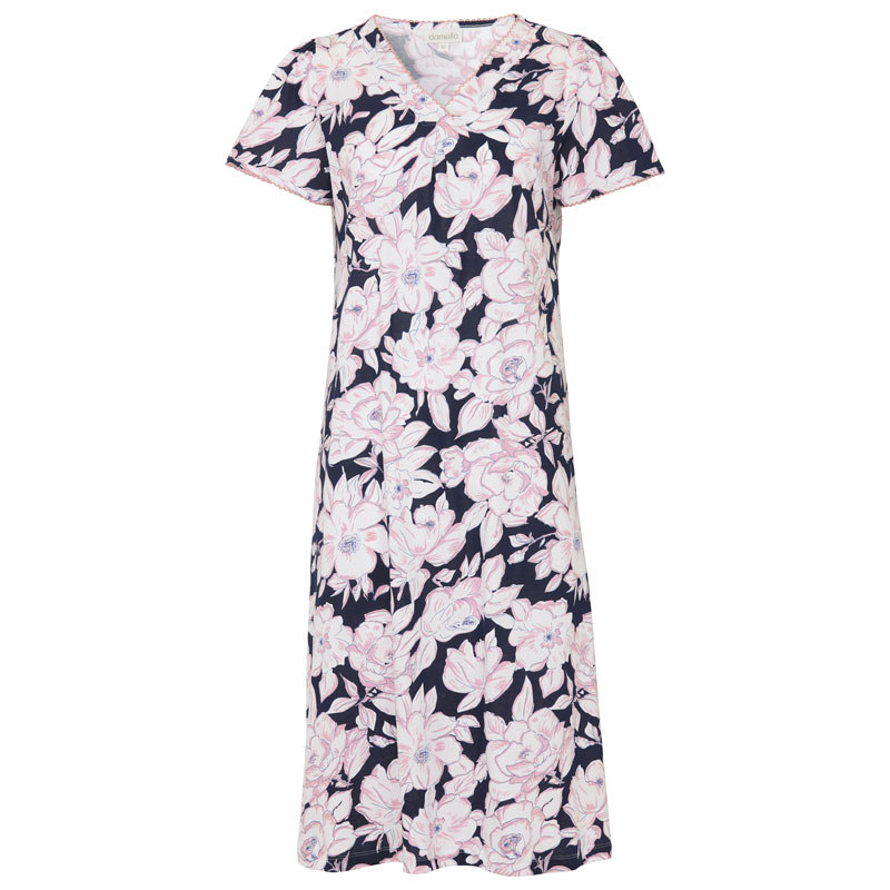 Fint nattlinne från Damella of Sweden. Behagligt nattlinne i ekologisk bomullsjersey. Designad med V-ringning, ett veck framtill och kort ärm.