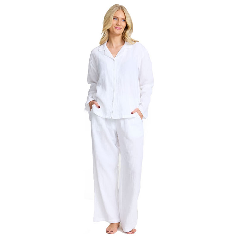 Skjortan har långa ärmar och knäppning fram för en avslappnad känsla. Byxorna har fickor i sidan, resår i midjan och dragsko för justerbar passform.