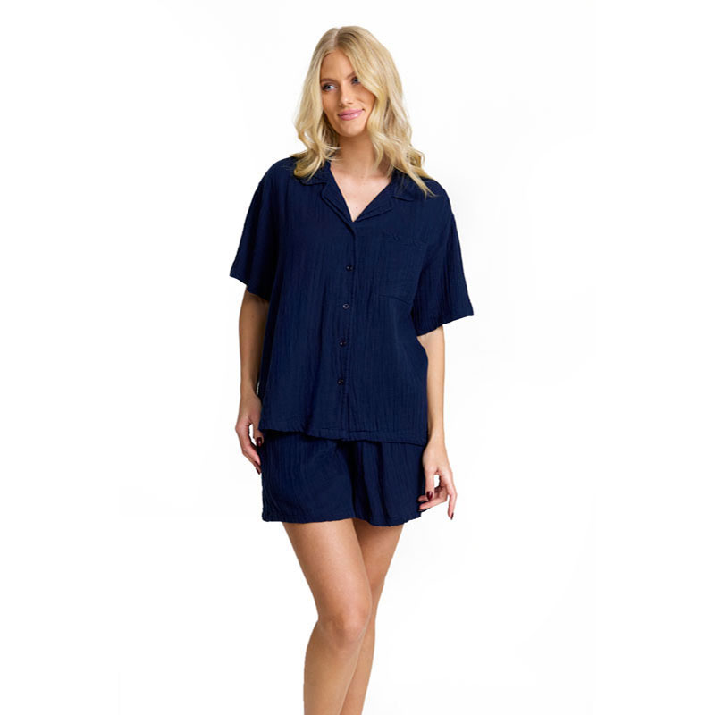 Bekväm skjorta med korta ärmar och knäppning fram för en avslappnad känsla. Shortsen har fickor i sidan, resår i midjan och dragsko för justerbar passform.