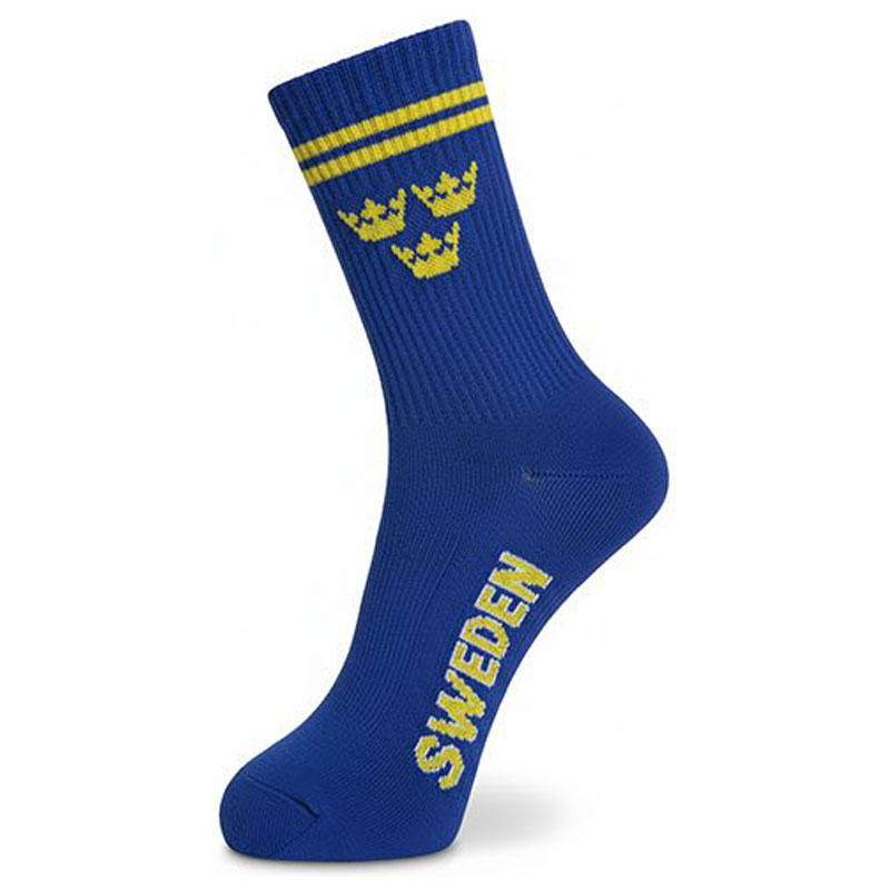 Härliga sportstrumpor från Nordic Souvenir, med en blå botten och gula detaljer.