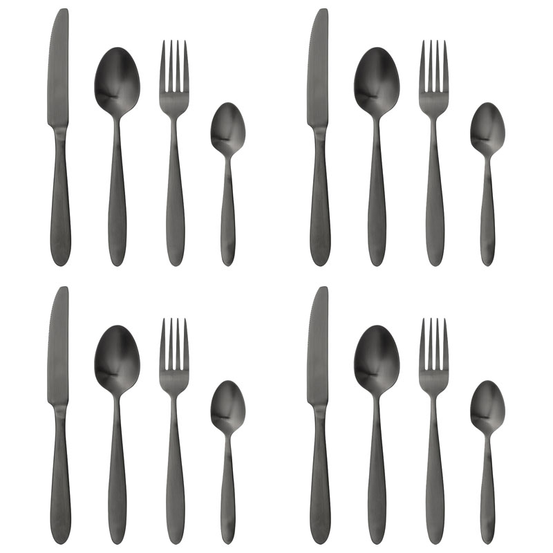 Frea bestickset från Bloomingville är ett 16-delars set i rostfritt stål med en slät svart PVD-belagd finish.