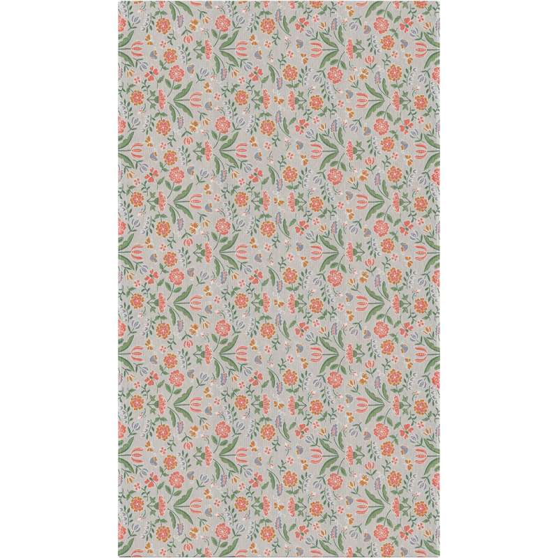 Blomglänta får Ekelund är en härlig bordsduk tillverkad i 100% ekologisk bomull, med motiv av flerfärgade blommor mot en grå botten.