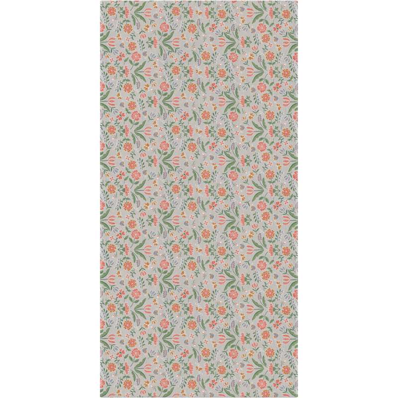 Blomglänta får Ekelund är en härlig bordsduk tillverkad i 100% ekologisk bomull, med motiv av flerfärgade blommor mot en grå botten.