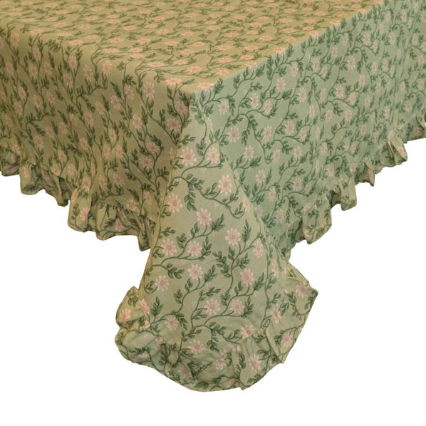 Vacker duk från Redlunds, med en tjusig volang runt om. I ett gulligt blommigt mönster skapat av svensk designer.