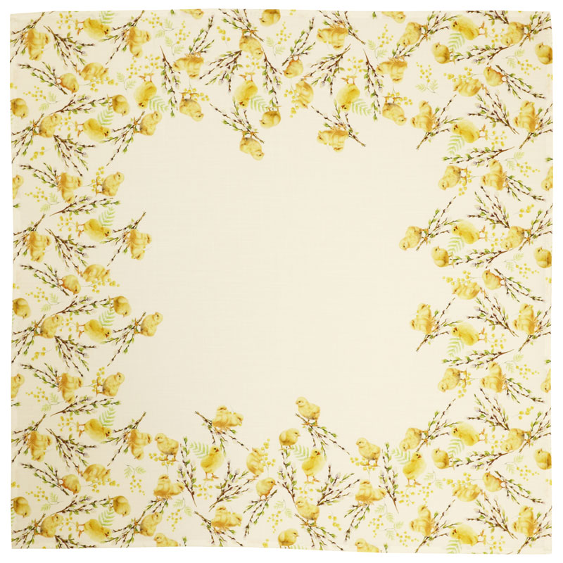 Gullvor är en vacker duk med motiv av söt små kycklingar, ett perfekt tillskott för dig som vill skapa en lekfull och varm påskdukning.
