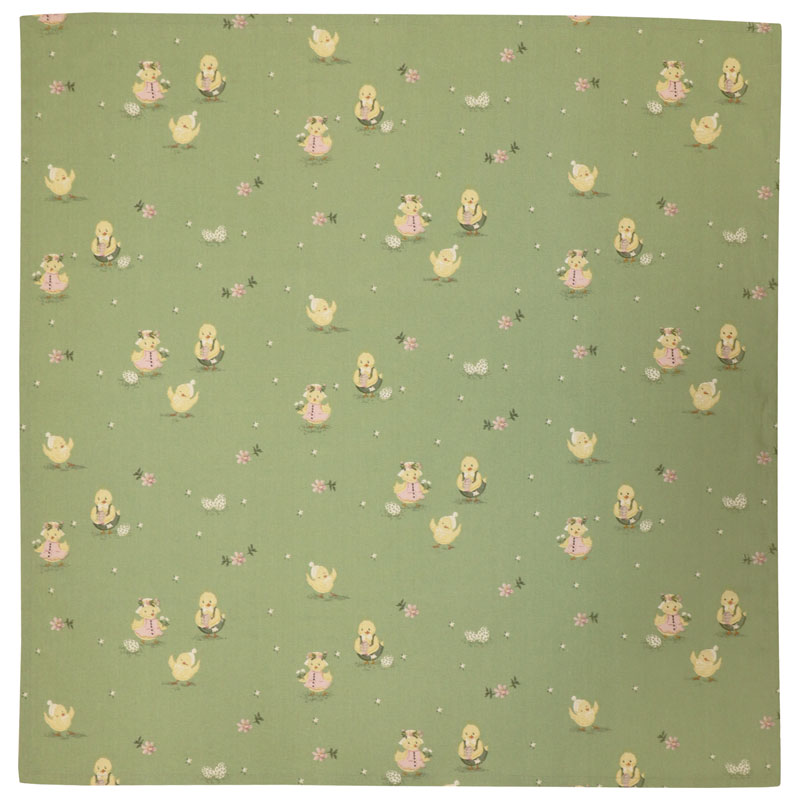 Urgullig duk med tryckta kycklingar och påskägg på från Redlunds. Mönster skapat av svensk designer.