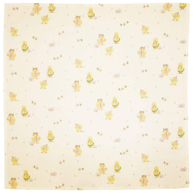Urgullig duk med tryckta kycklingar och påskägg på från Redlunds. Mönster skapat av svensk designer.