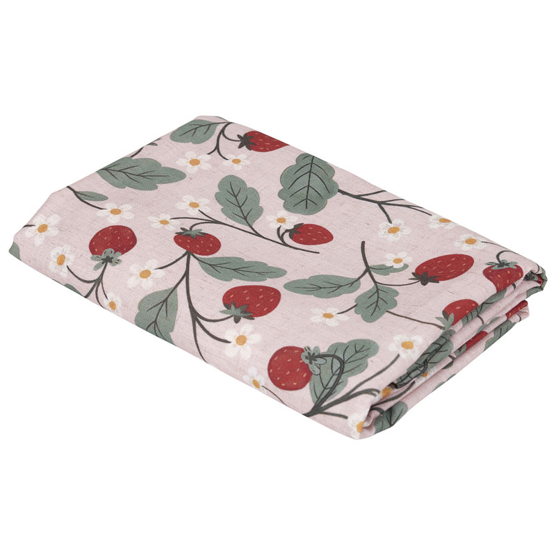 Den är dekorerad med små, fina jordgubbar i klarrött, med gröna blad som ger liv åt mönstret.