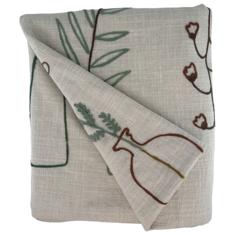 Snygg broderad bordsduk med stora motiv av flaskor, blommor och blad mot en natur/linnefärgad botten.