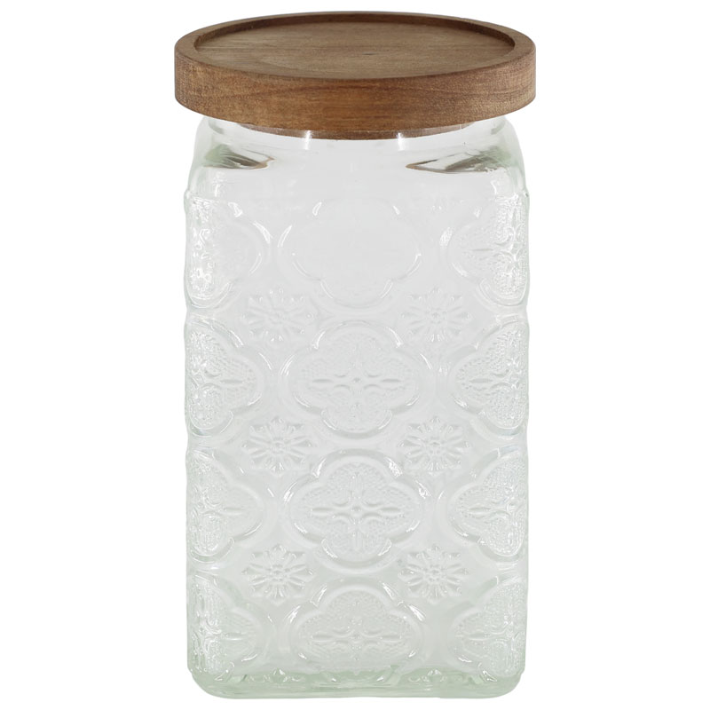Läcker förvaringsburk med ett charmigt blommönster, tillverkad i glas från Chic Antique. Designad i en kantig modell med ett fint lock i akaciaträ.