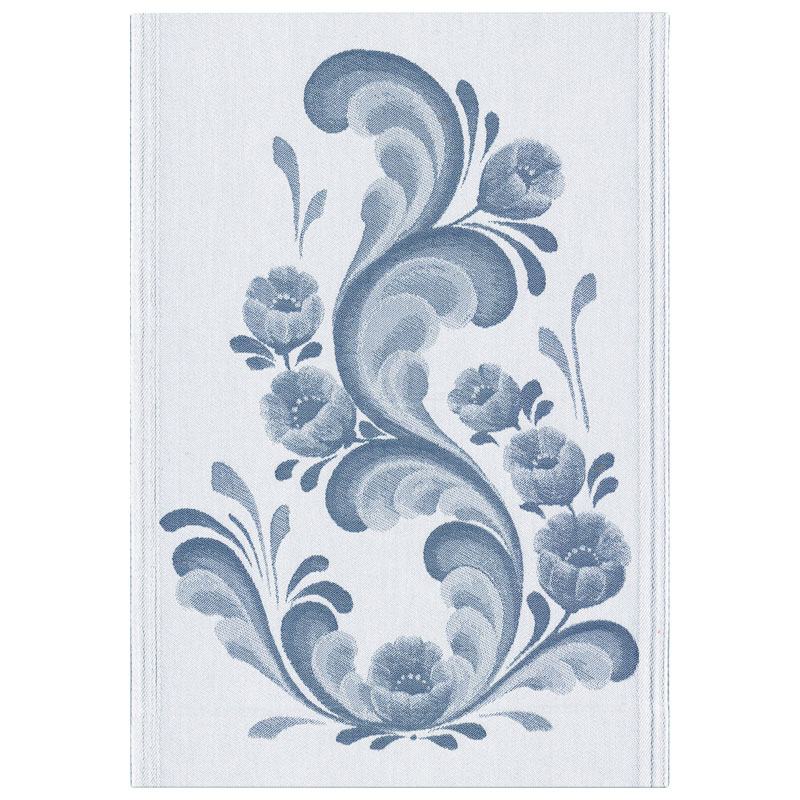 Carl är en vacker kökshandduk från Ekelund, med mörkblått kurbitsmotiv mot en vit botten.