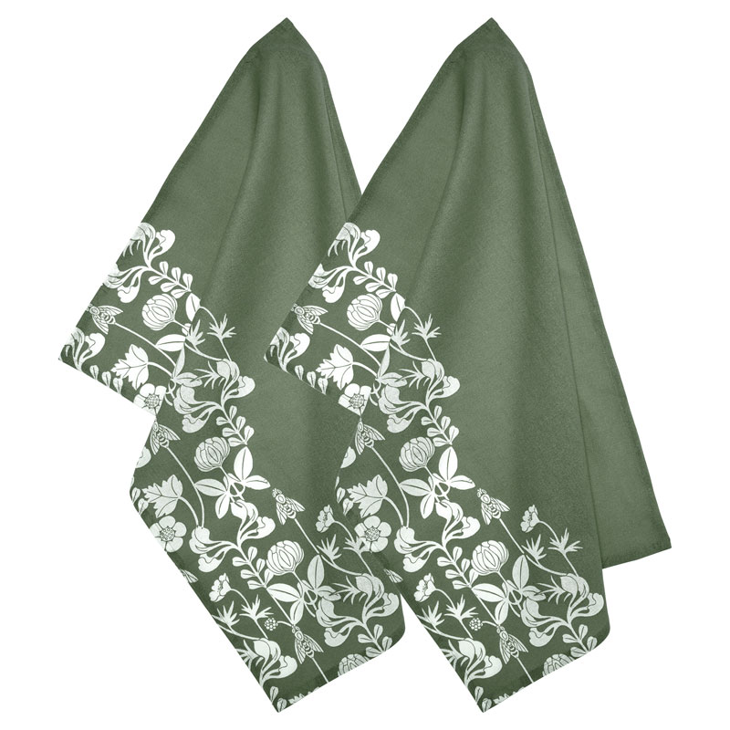 De Mina från Svanefors, fint 2-pack kökshanddukar med tryckt mönster av Carl Larsson med vita blommor och blad på en mossgrön bakgrund.