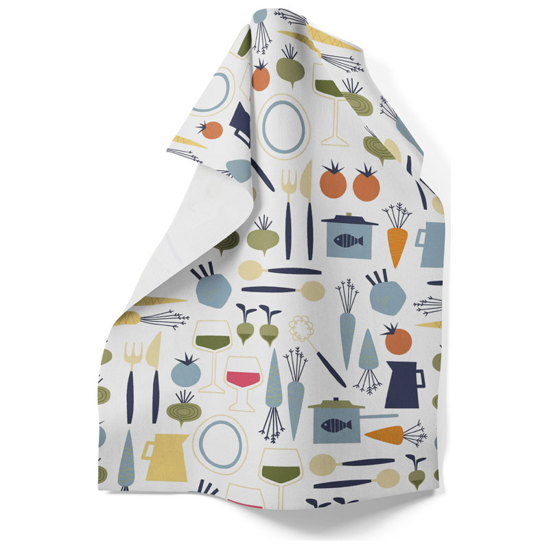 Dinner från Arvidssons Textil är en kökshandduk med motiv av grönsaker, rotfrukter och köksredskap.