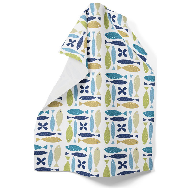 Fina Fisken från Arvidssons Textil är en kökshandduk med motiv av fiskar i olika blå nyanser.