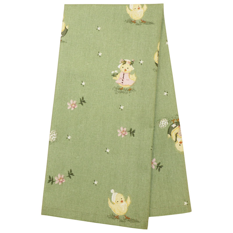 Urgullig kökshandduk med tryckta kycklingar och påskägg på från Redlunds. Mönster skapat av svensk designer.