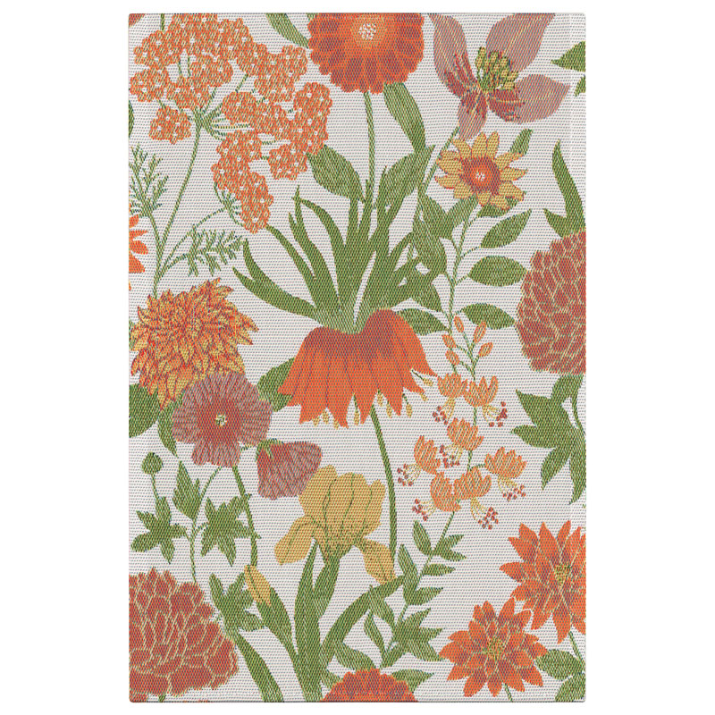 Klara är en vacker kökshandduk från Ekelund, med blommönster i orange/rosa nyans mot en vit botten.