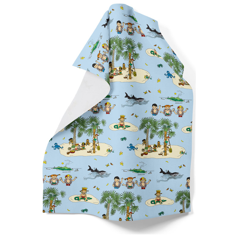 Underbar kökshandduk från Arvidssons Textil med motiv av Pippi, Tommy och Annika på äventyr vid Kurrekurreduttön.