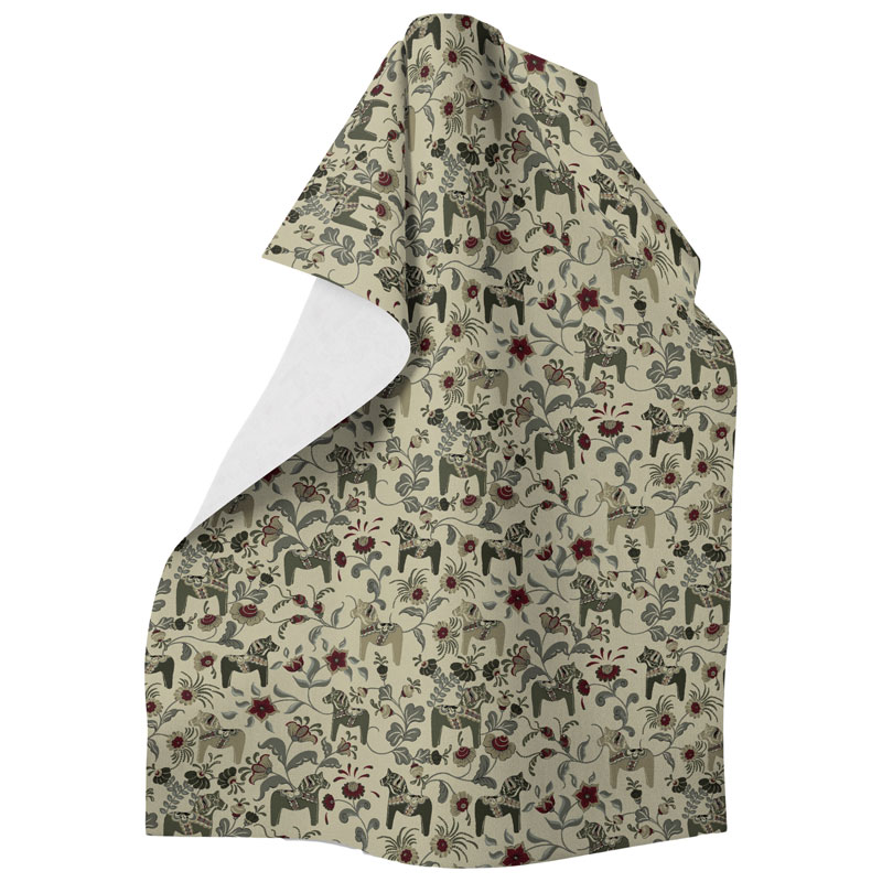 Trevlig kökshandduk från Arvidssons med fint kurbitsmönster och dalahästar i färgerna beige och grönt med vinröda inslag mot ljusbeige botten.