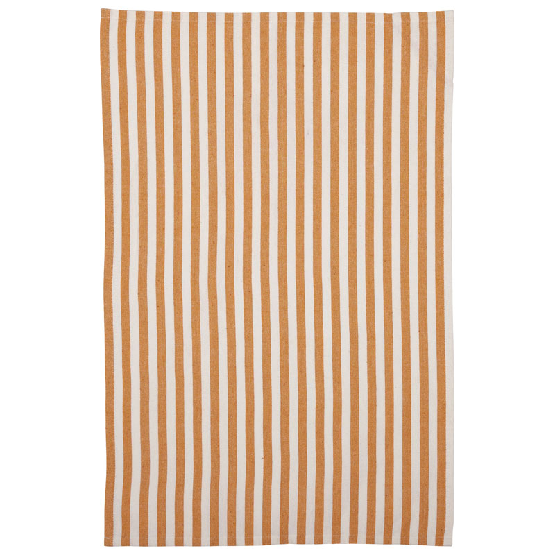 Kökshandduken har ett snyggt randigt mönster i färgerna vitt och apelsin.