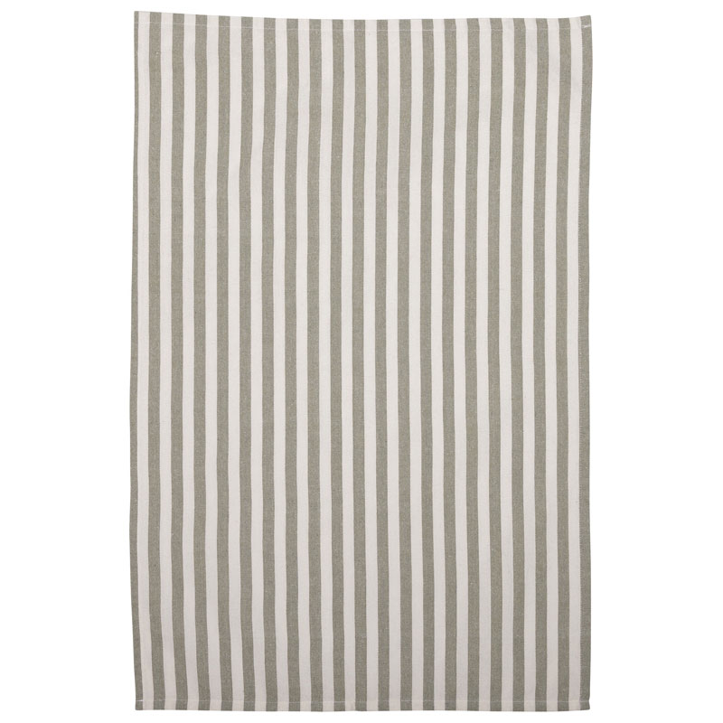 Kökshandduken har ett snyggt randigt mönster i färgerna vitt och lindgrön.