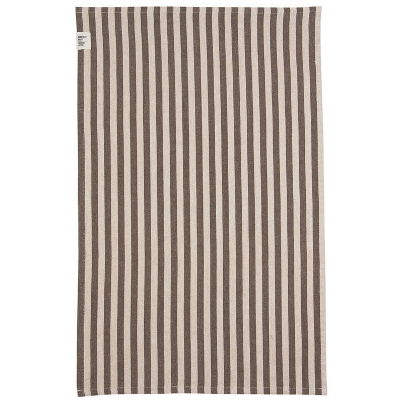 Svea från Fondaco, klassisk kökshandduk i återvunnet material med tidlöst smalrandigt mönster i nougat/offwhite och hank för enkel upphängning.