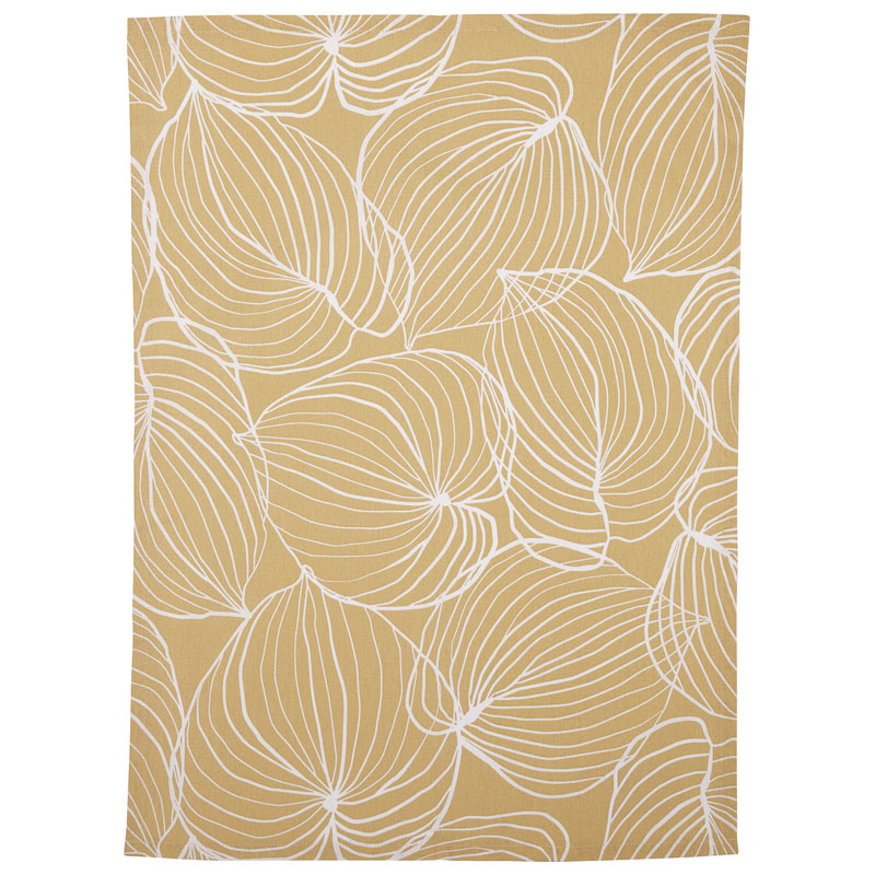 Tilda från Fondaco, gul kökshandduk med grafiskt mönster av stora, vita blad.