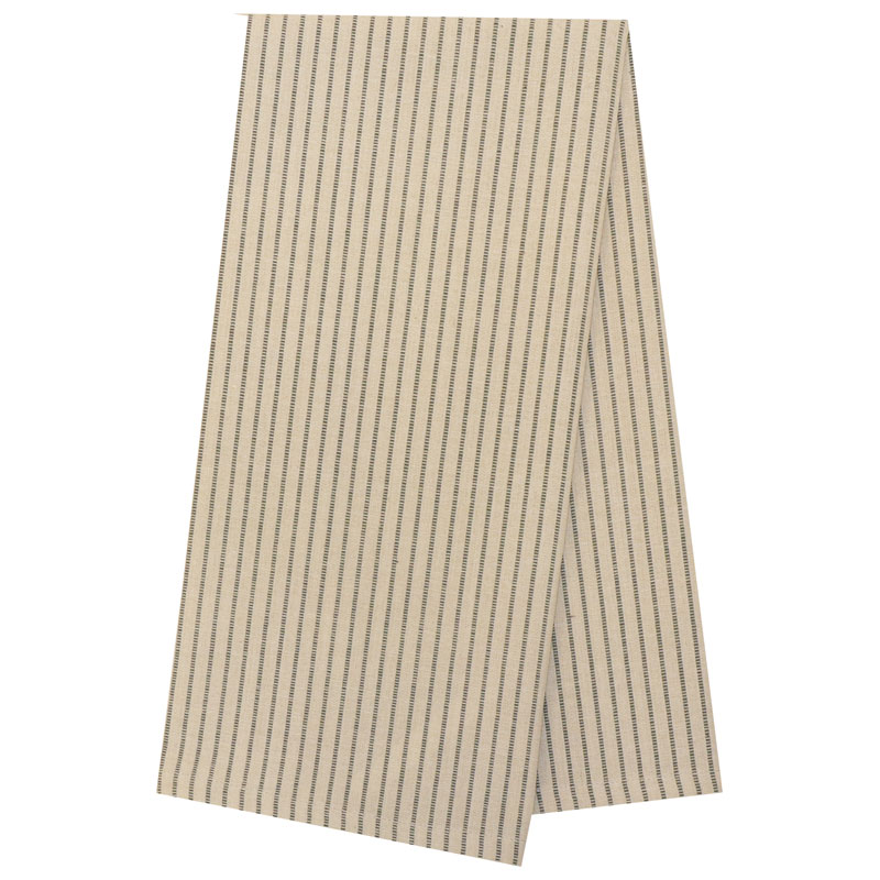 Prydd av ett smalrandigt mönster i grönt mot en beige/linnefärgad botten.