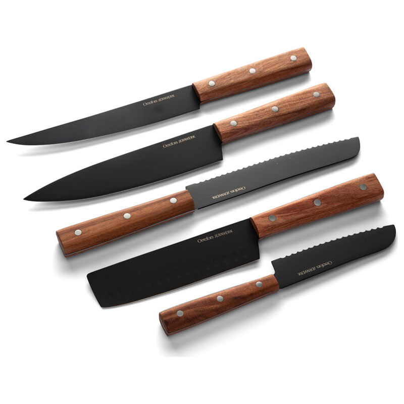 Stilrent och användbart set om fyra knivar från Orrefors Jernverk. Setet innehåller en kockkniv, en brödkniv, en filékniv, en santokukniv och en tomatkniv.
