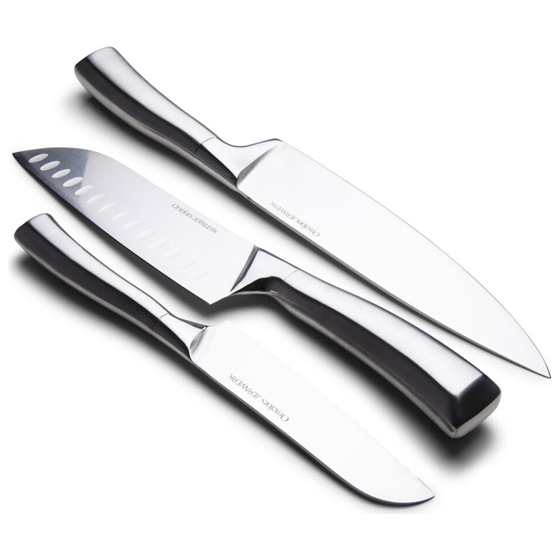 Snyggt och användbart set om tre knivar från Orrefors Jernverk. Setet innehåller en japansk kockkniv, en kockkniv och en tomatkniv i rostfritt stål.