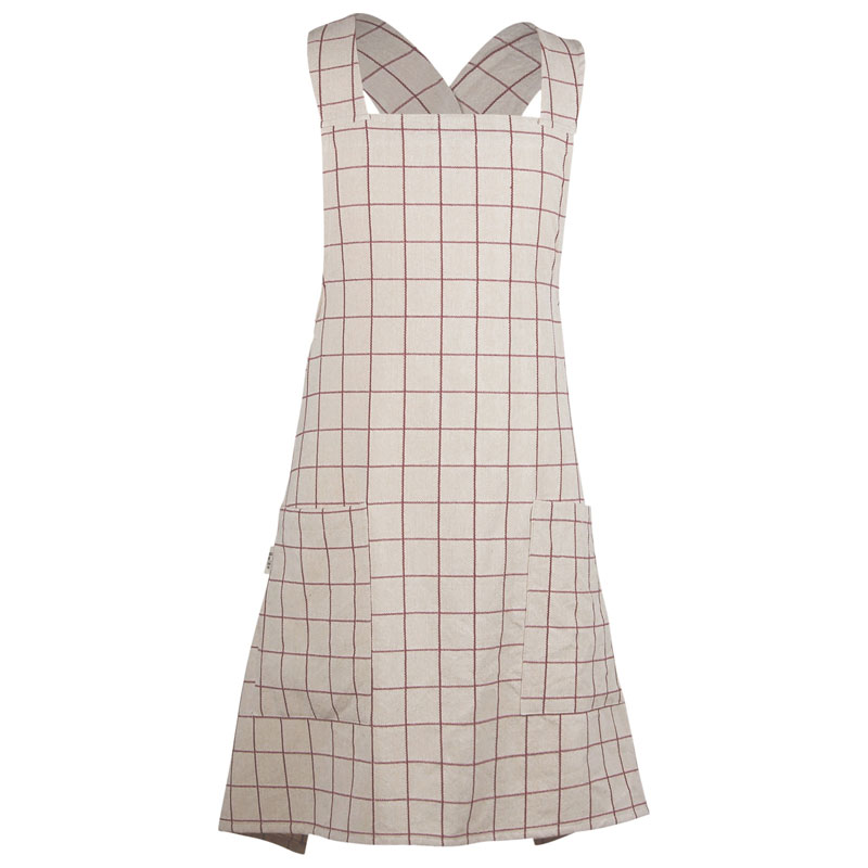 Rutigt förkläde från Fondaco tillverkat i återvunnet material. Med breda axelband som är korslagda i ryggen och två praktiska fickor framtill.
