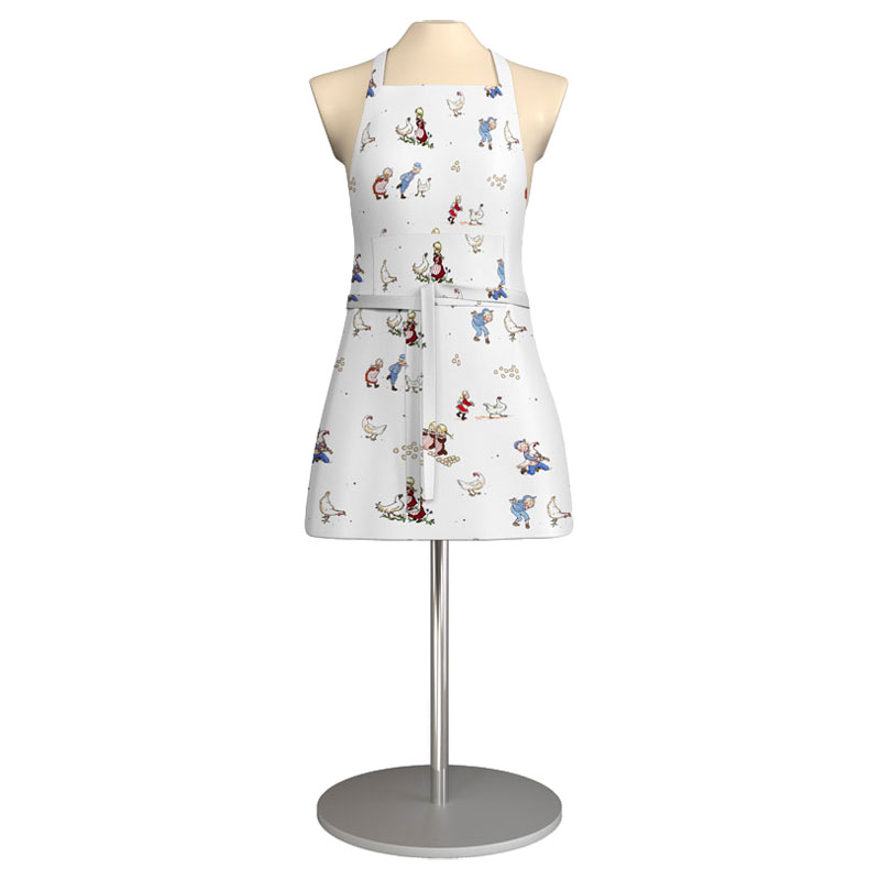 Lekfullt barnförkläde från Arvidssons Textil med motiv av Emil och Ida i hönsgården.