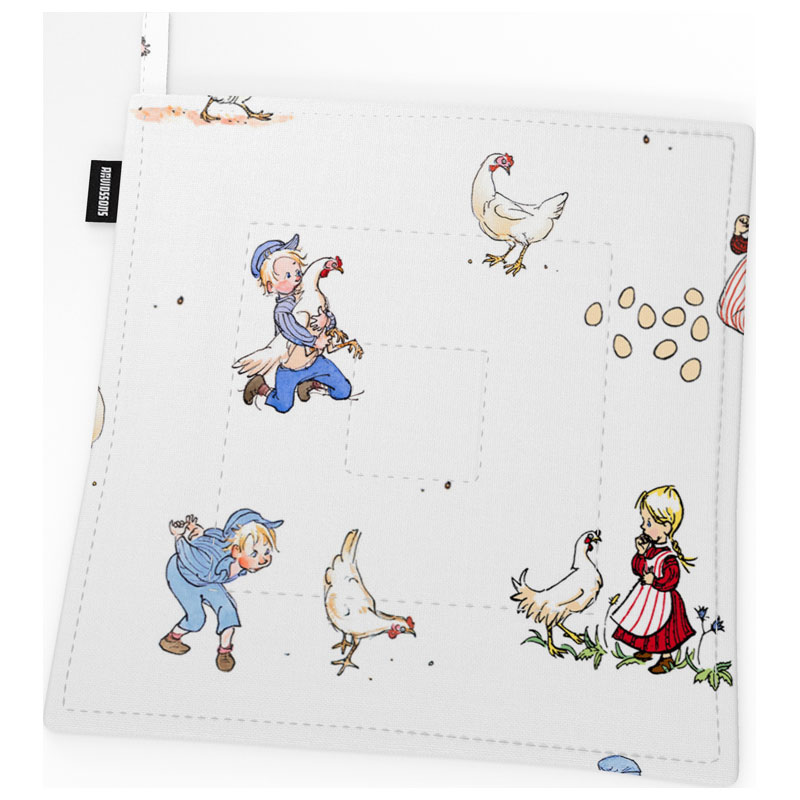 Lekfull grytlapp från Arvidssons Textil med motiv av Emil och Ida i hönsgården.