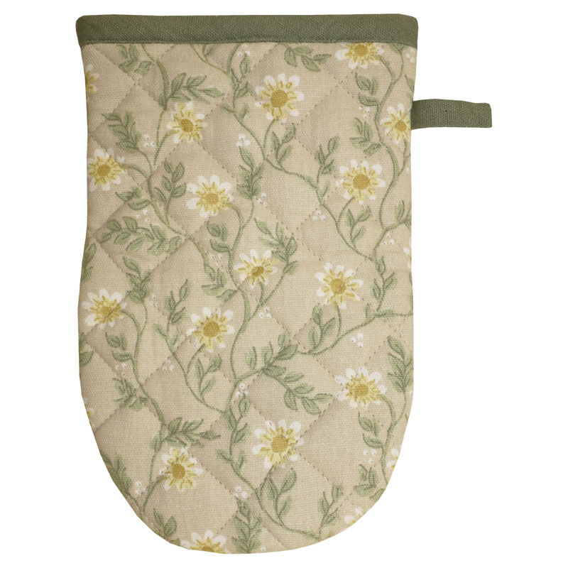 Gullig grillvante från Redlunds, med ett fint blommigt mönster mot en enfärgad beige botten. Praktisk ögla för enkel upphängning.