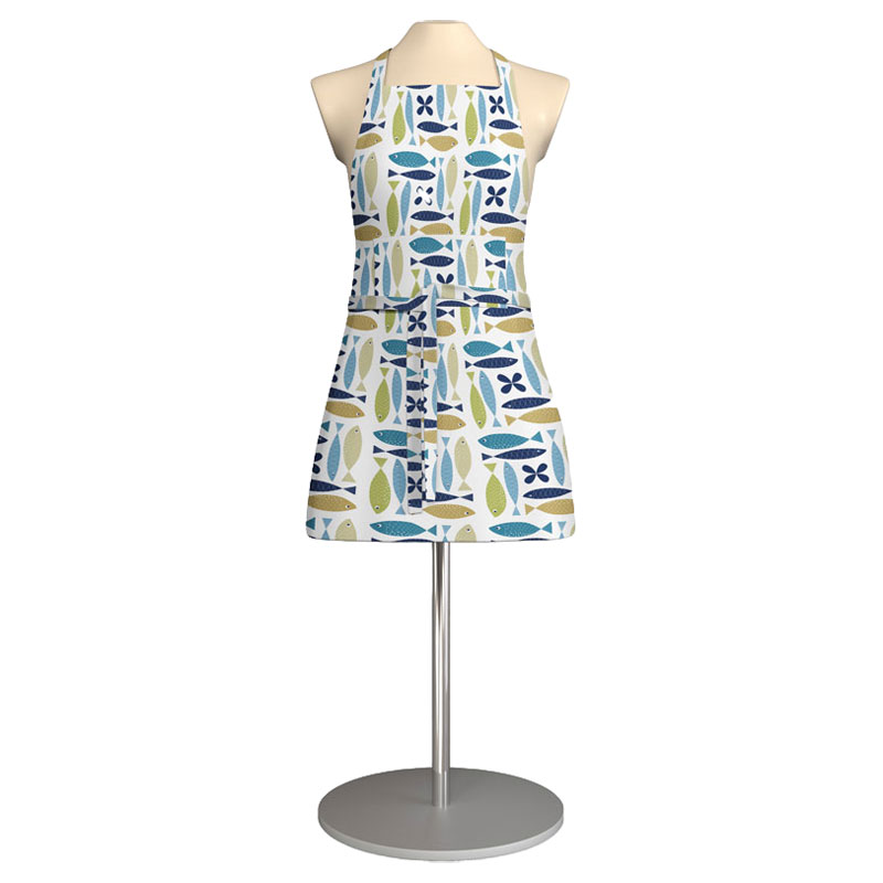 Fina Fisken från Arvidssons Textil är ett förkläde med motiv av fiskar i olika blå nyanser.