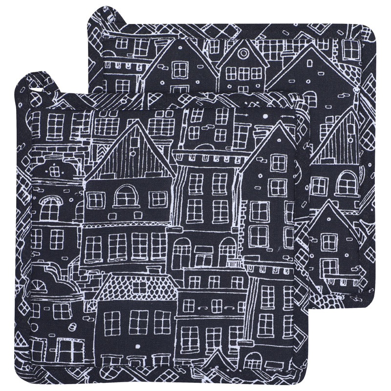 Gustav 2-pack grytlappar från Recycled by Wille, med ett motiv av hus i vitt mot en svart botten.