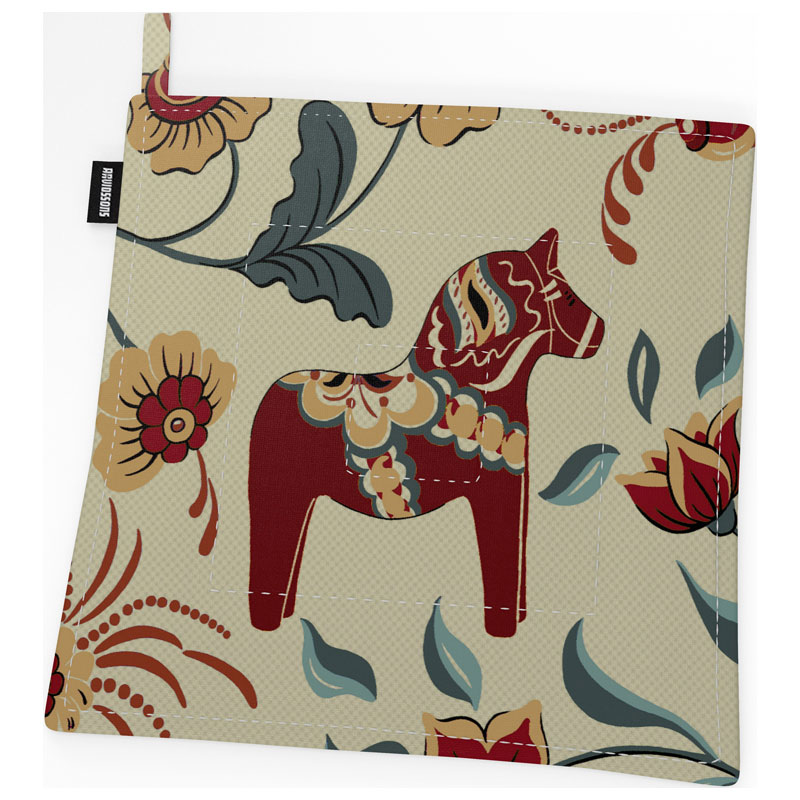 Trevlig grytlapp från Arvidssons med fint kurbitsmönster och dalahästar i röda, blå och beige nyanser mot ljusbeige botten.