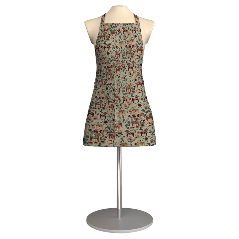 Trevligt förkläde från Arvidssons med fint kurbitsmönster och dalahästar i färgerna rött, blått och gult mot ljusbeige botten.