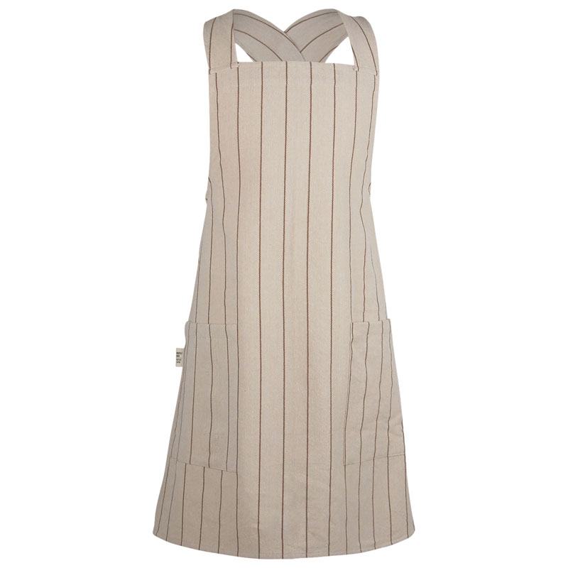 Randigt förkläde från Fondaco tillverkat i återvunnet material. Med breda axelband som är korslagda i ryggen och två praktiska fickor framtill.