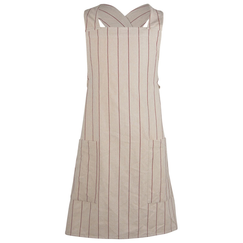 Randigt förkläde från Fondaco tillverkat i återvunnet material. Med breda axelband som är korslagda i ryggen och två praktiska fickor framtill.