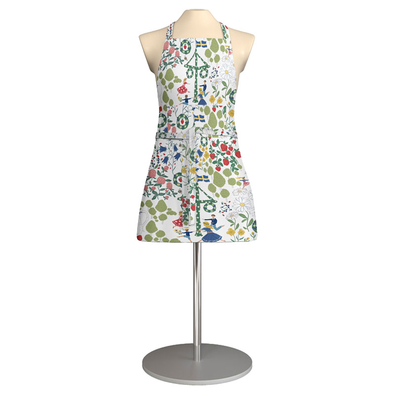Midsommardans från Arvidssons Textil, charmigt förkläde med motiv av blommor och växter som speglar klassisk, svensk sommar. I mönstret syns även dans runt midsommarstången.