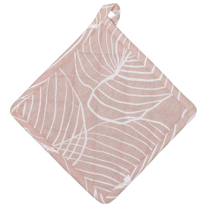 Tilda från Fondaco, rosa grytlapp med ett grafiskt mönster av stora, vita blad.