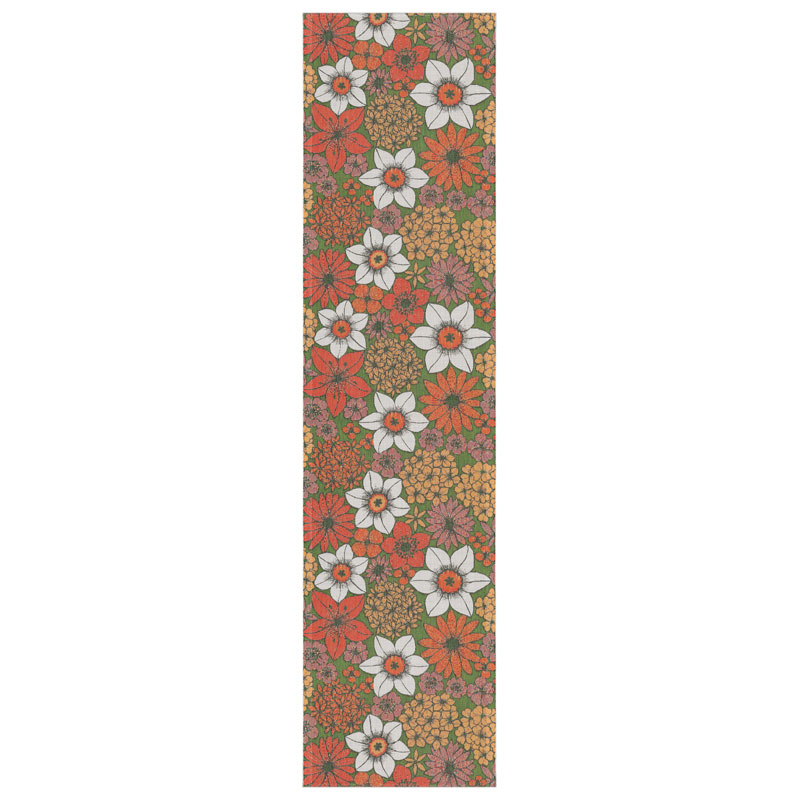 April är en vacker bordslöpare från Ekelund, prydd av ett flerfärgat blommönster mot en grön botten.