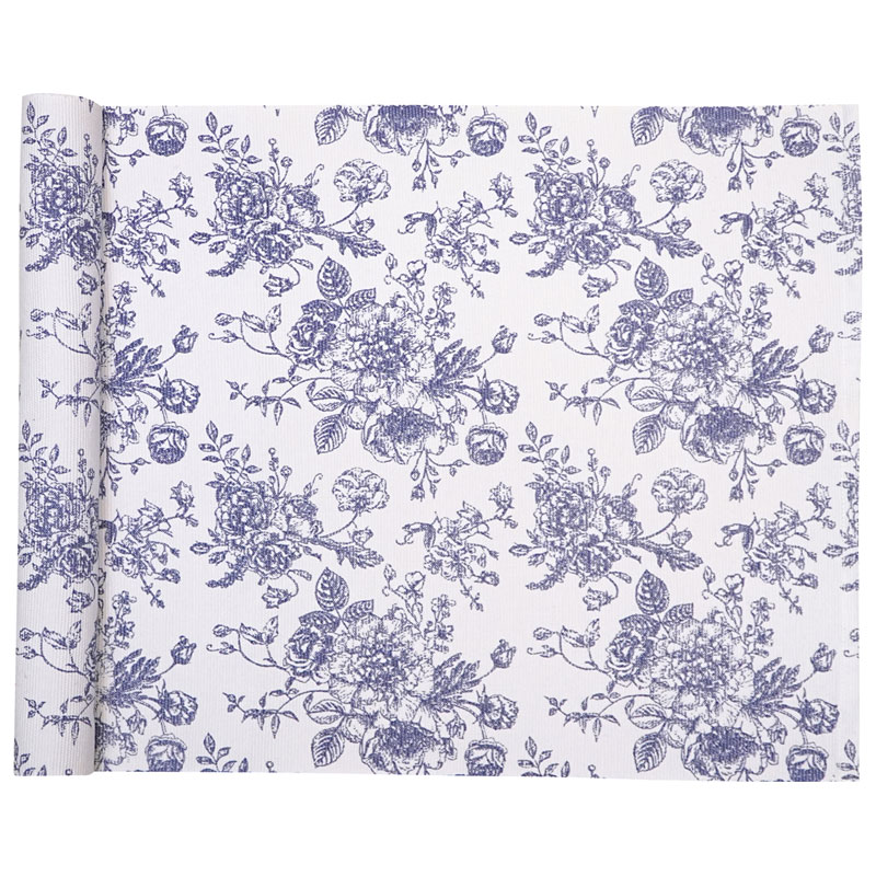 Juni är en vacker löpare från Classic Textiles, tillverkad i 99% återvunnet material. En stilig löpare med ett snyggt blommigt mönster i blått mot en vit botten.