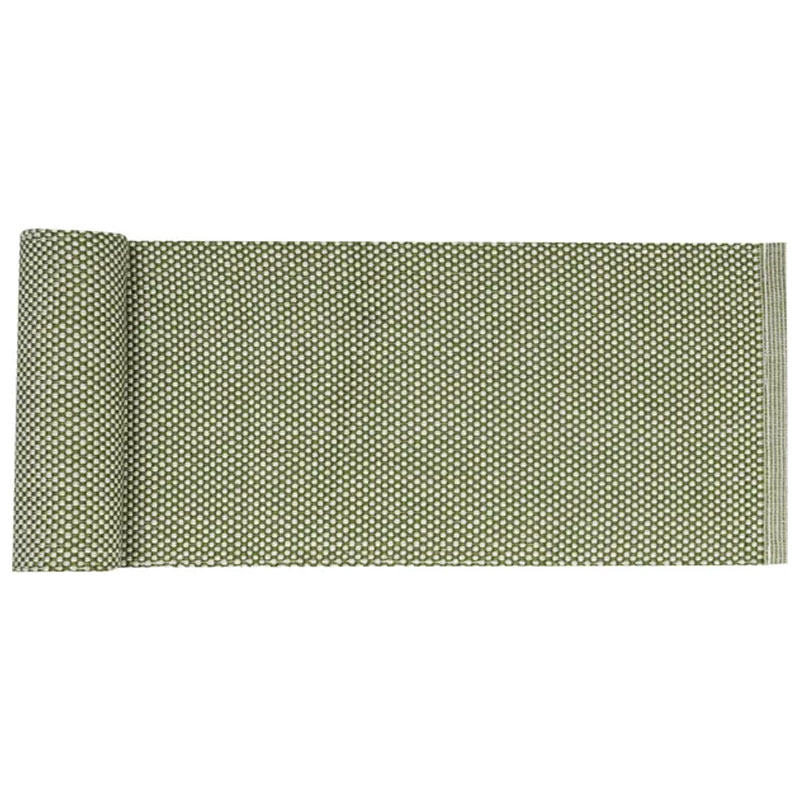 Chambray innebär att tyget är vävt av olikfärgade garner vilket ger det en något spräcklig färg och ett levande uttryck. Denna vackra löpare är vävd med gulgrå och vita garner.