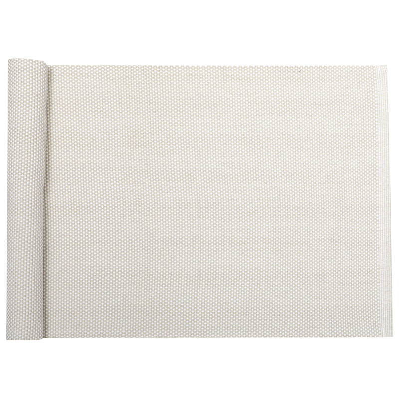 Chambray innebär att tyget är vävt av olikfärgade garner vilket ger det en något spräcklig färg och ett levande uttryck. Denna vackra löpare är vävd med gulgrå och vita garner.