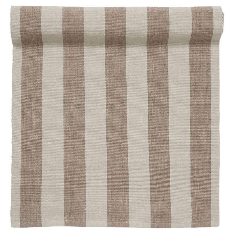En modern löpare i en greige färg med breda ränder i brunt från Jakobsdals. Ett vackert tillskott till dukningen.