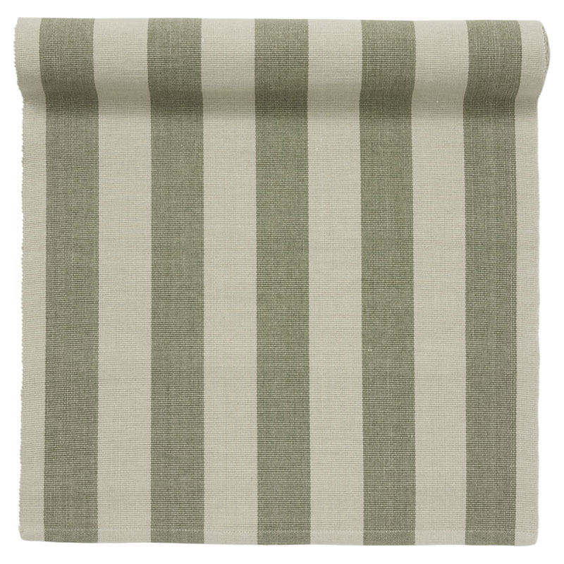 En modern löpare i en greige färg med breda ränder i grönt från Jakobsdals. Ett vackert tillskott till dukningen.